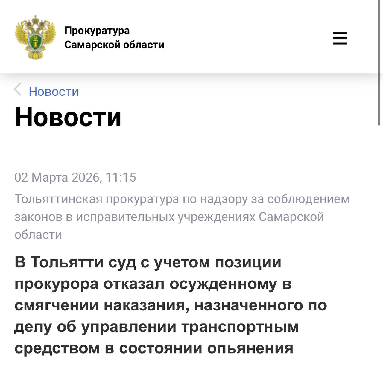 В ноябре 2023 года Центральный районный суд г. Тольятти вынес приговор по уголовному делу, которым осужденный признан виновным по ч. 2 ст. 264.1 УК РФ (управление транспортным средством в состоянии опьянения лицом, имеющим судимость за управление транспортным средством в состоянии опьянения, подвергнутым административному наказанию за управление транспортным средством в состоянии опьянения).
