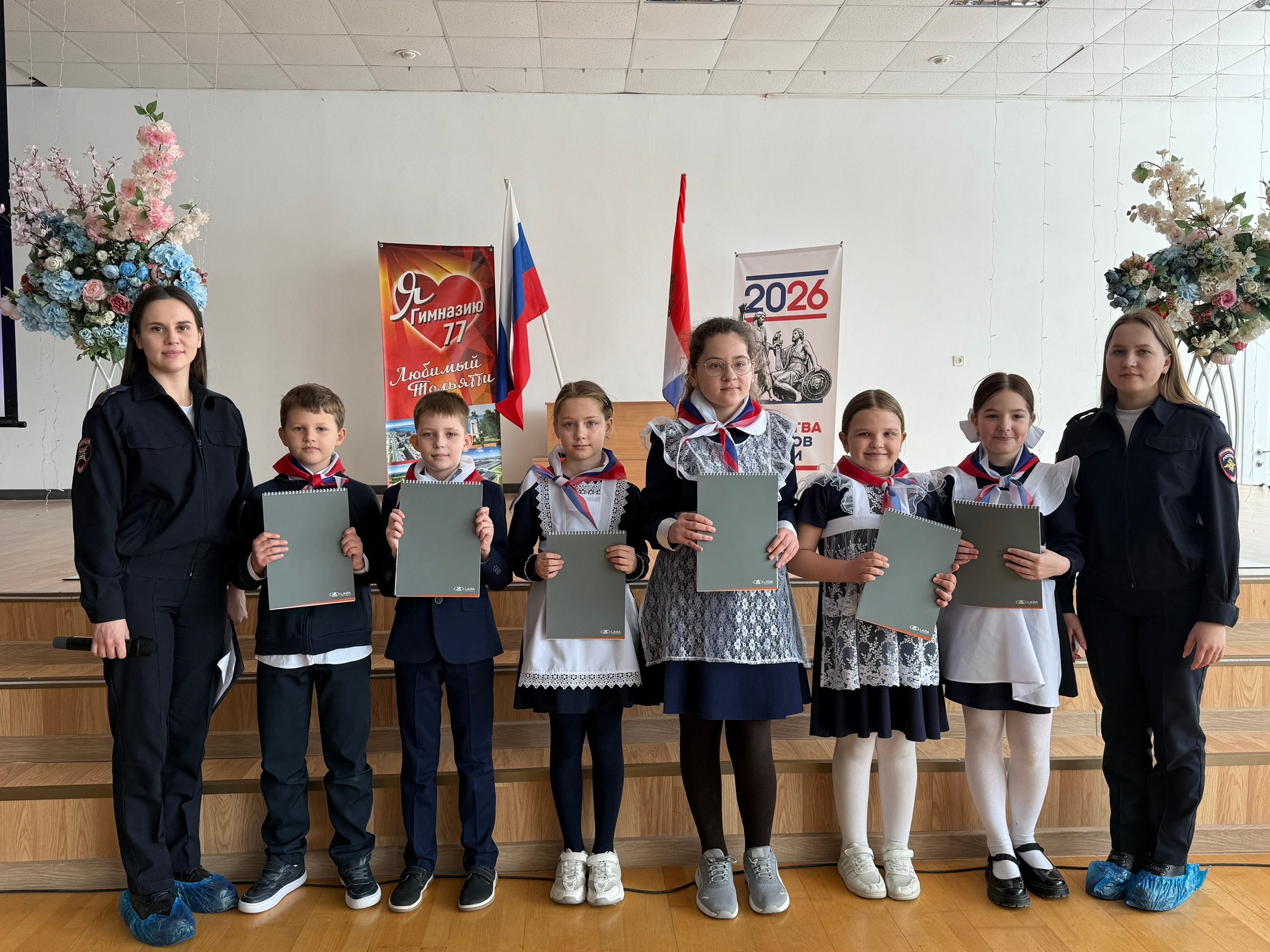 Ребят поприветствовала и напомнила о важностий соблюдения правил дорожного движения инспектор отделения пропаганды безопасности дорожного движения тольяттинской Госавтоинспекции, младший лейтенант Зайцева Екатерина Сергеевна.