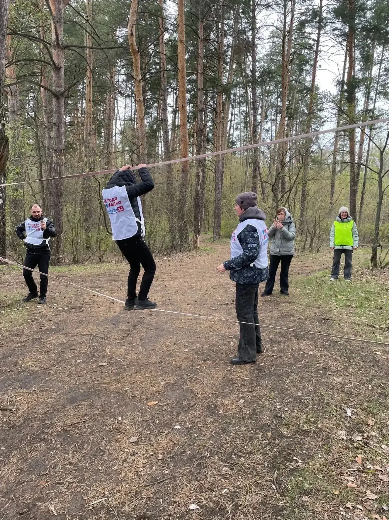 После предстартовой проверки успешно пройдены испытания от вязки узлов до разведения костра и установки палатки. Также на "отлично" коллектив справился с преодолением завала, транспортировкой условно пострадавшего на носилках по пересеченной местности и даже переправой по веревке с перилами! По итогу - взяли золото.