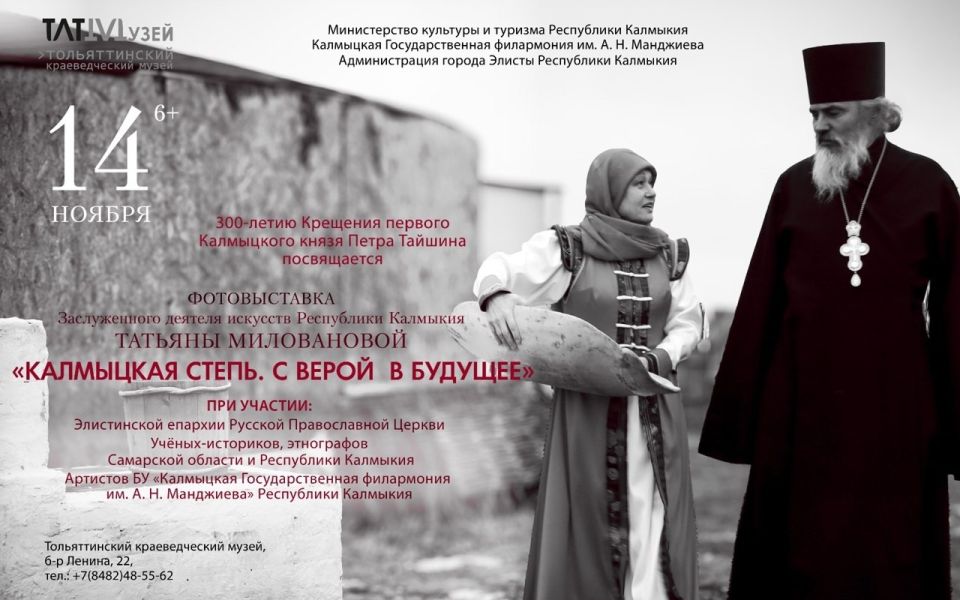 В Тольяттинском краеведческом музее 14 ноября с 10:00 до 18:00 будет работать однодневная фотовыставка «Калмыцкая степь. С верой в будущее». Она посвящена 300-летию крещения первого православного калмыцкого князя, внука Аюки Хана, Петра Тайшина, и...