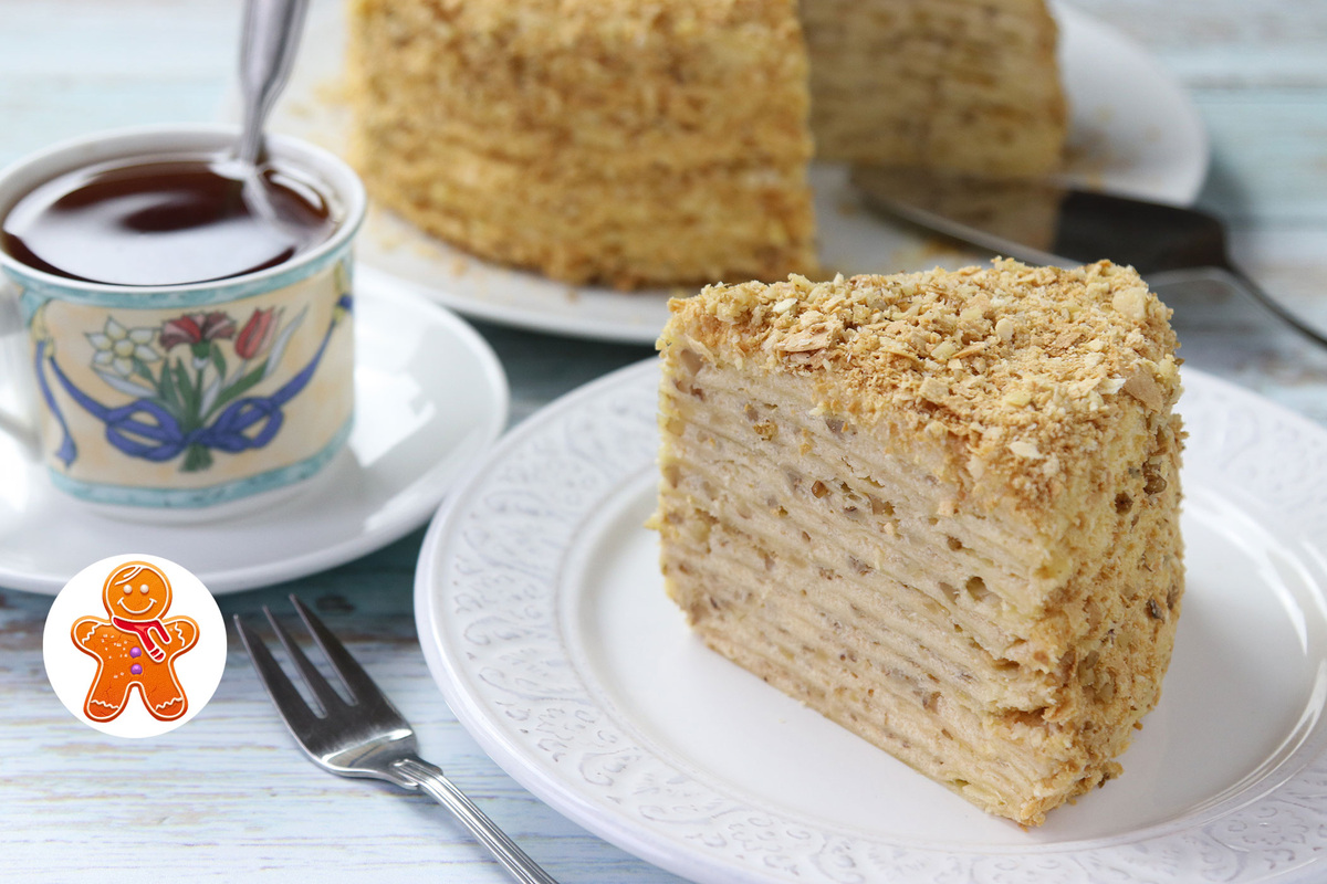После нескольких часов ожидания торт «Гранд Наполеон» нарезается на порции, готовый радовать своим вкусом на праздничном столе.