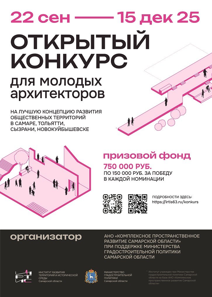 Стартовал открытый конкурс для молодых архитекторов на разработку концепций развития общественных пространств в городских округах Самара, Тольятти, Новокуйбышевск, Сызрань, который проводится по поручению Губернатора Самарской области автономной некоммерческой организацией «Комплексное пространственное развитие Самарской области» при поддержке министерства.