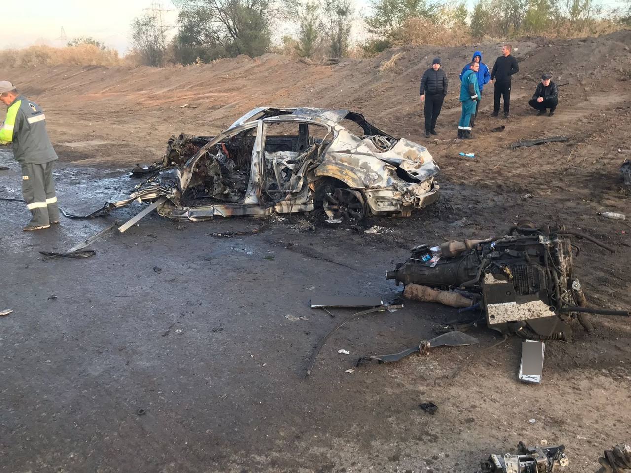 На кадрах — выжженный автомобиль "Инфинити" и разбросанные по дороге детали машины, в том числе двигатель, лежащий в нескольких метрах от иномарки.
