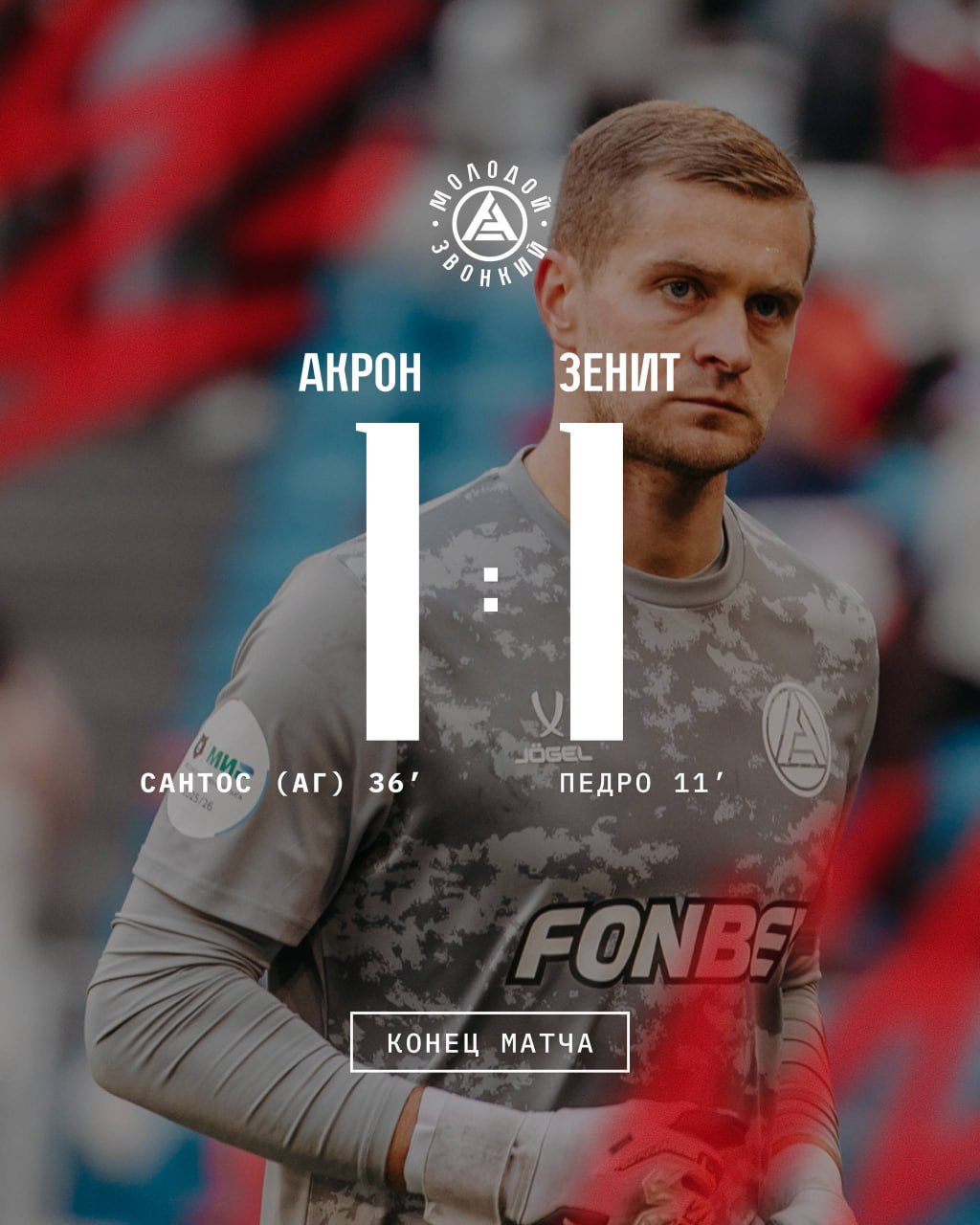 Футбольный матч "Акрона" и "Зенита" завершился со счетом 1:1. Оба гола были забиты в первом тайме.