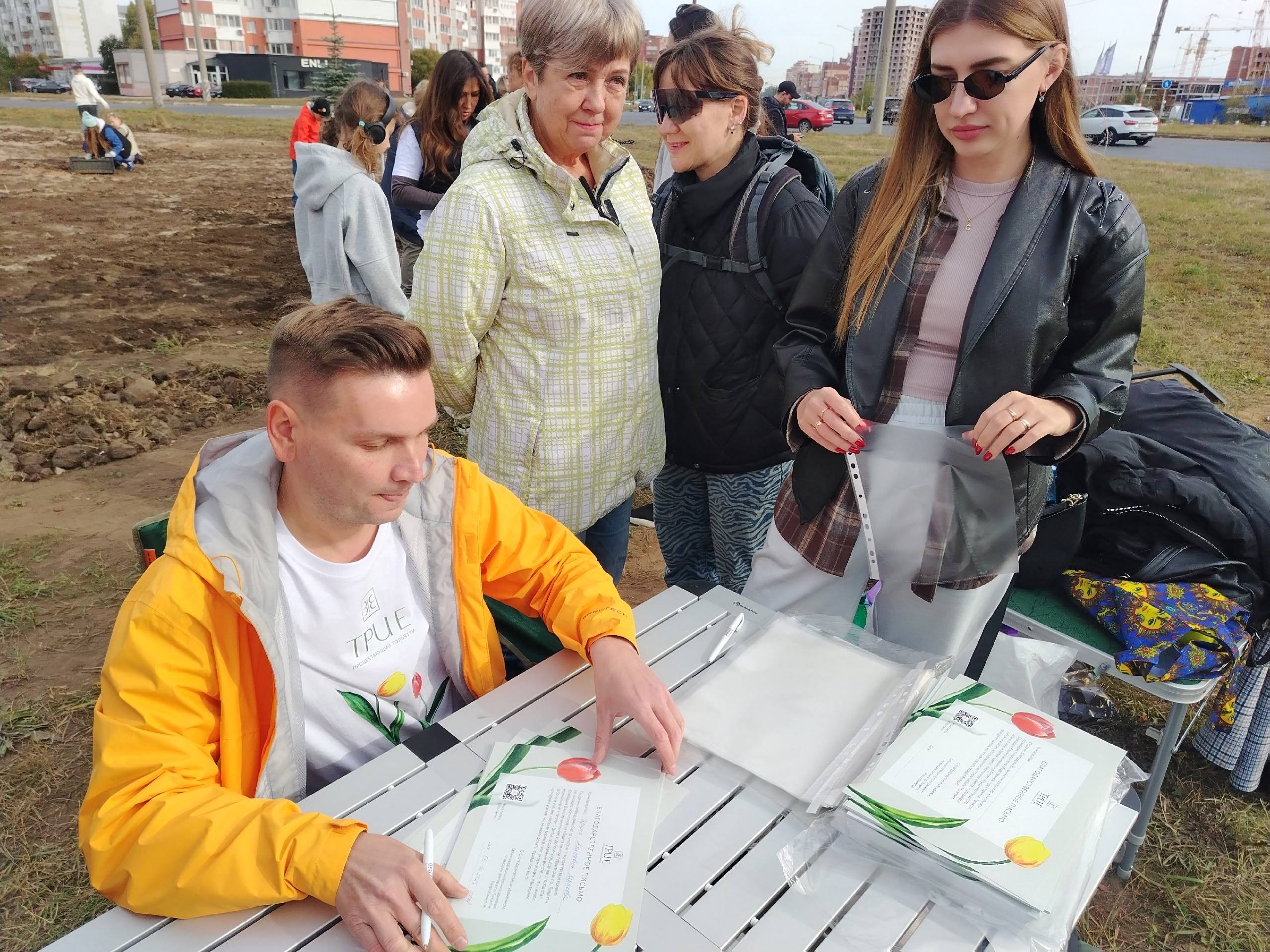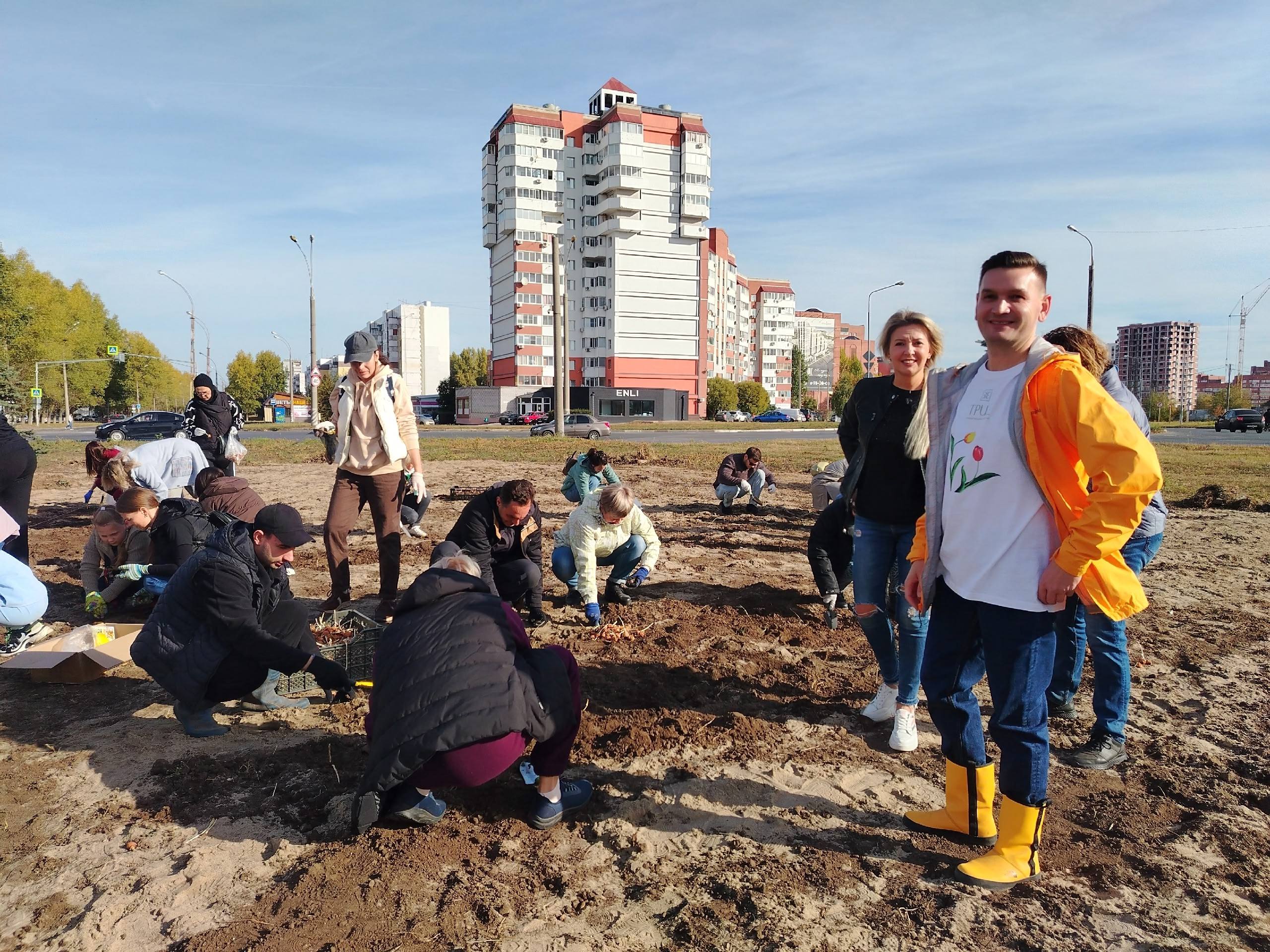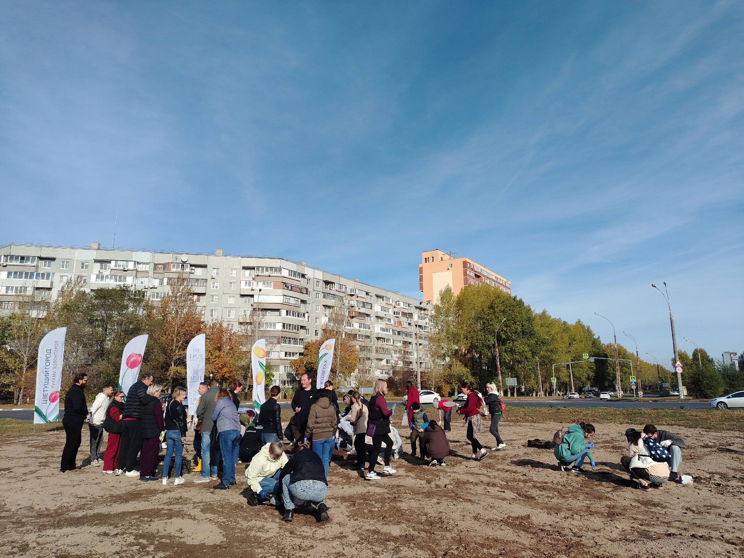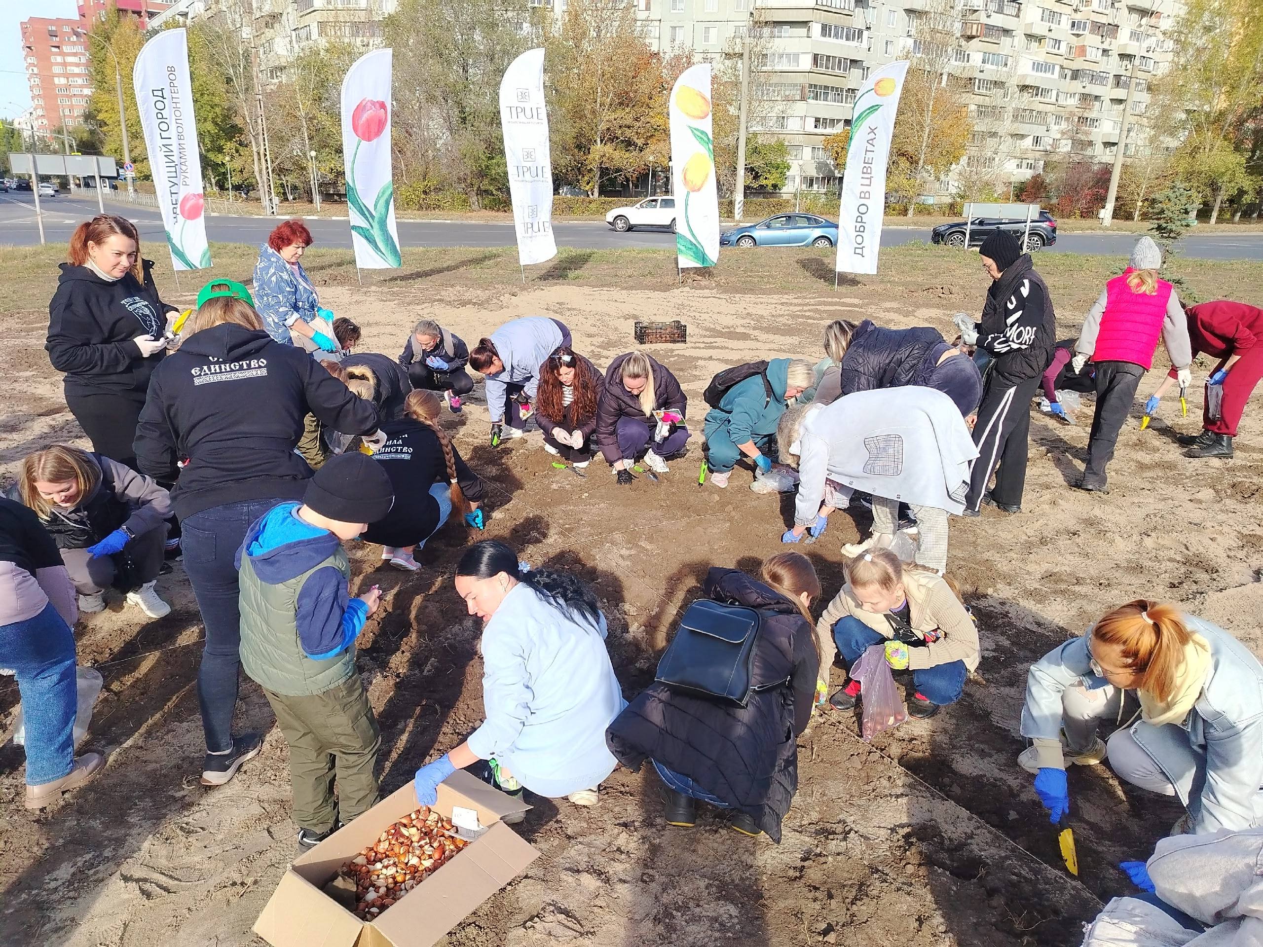 Цветущий город руками волонтёров! На кольцевой развязке улиц 40 Лет Победы, Тополиная, Дзержинского неравнодушные тольяттинцы высаживают тюльпаны
