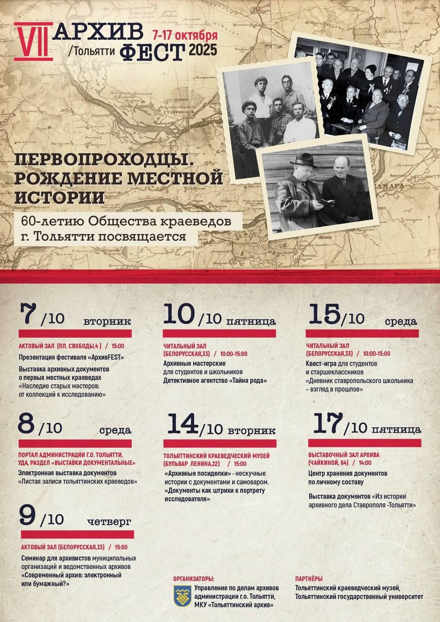 С 7 по 17 октября управление по делам архивов проводит седьмой фестиваль «АрхивFEST», посвященный 60-летию Общества краеведов г. Тольятти. Тема этого года: «Первопроходцы. Рождение местной истории». В рамках фестиваля пройдут традиционные мероприятия.