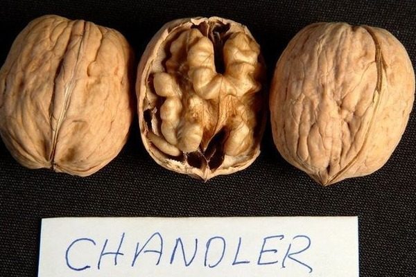 Плоды Чандлера отличаются крупными размерами, вес достигает 13,9 граммов. Их шершавая скорлупа защищает ядро, однако открывается она легко. Внутреннее содержимое орехов имеет белый цвет с высокой маслянистостью, от 60 до 70%. Вкус отличается сладостью, без горечи, что делает их особенно привлекательными для потребителей.
