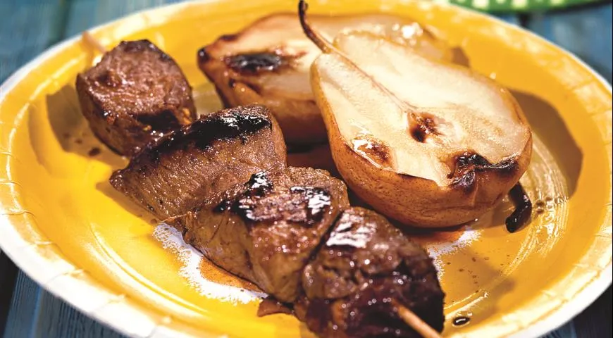 Груши, которые необходимо подготовить, стоит очистить от сердцевины и нарезать на крупные дольки. Далее на шампурах чередуют кусочки мяса и груши. В процессе жарки шашлыка на мангале важно часто переворачивать шампуры, чтобы мясо равномерно подрумянилось. Обжаривать шашлык потребуется около 15-20 минут: груши будут слегка карамелизироваться, что добавит блюду особый аромат и сладковатую нотку.
