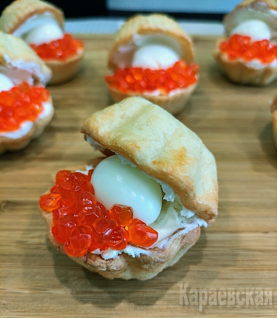 Теперь приходит время начинить тарталетки. Каждая из них наполняется кремом чиз, а в половину из них добавляется по перепелиное яйцо и немного красной икры. Для визуального эффекта, нужно соединить две тарталетки: одну с икрой и яйцом, а другую — только с кремом. Такой оригинальный и привлекательный подход не оставит равнодушными ни одного гостя на вашем празднике!