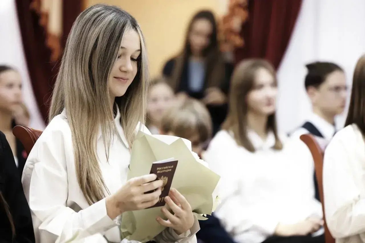Паспорта и экземпляры Конституции получили 14-летние школьники, активисты «Движения Первых», которые уже достигли успехов в учебе, спорте и общественной жизни.