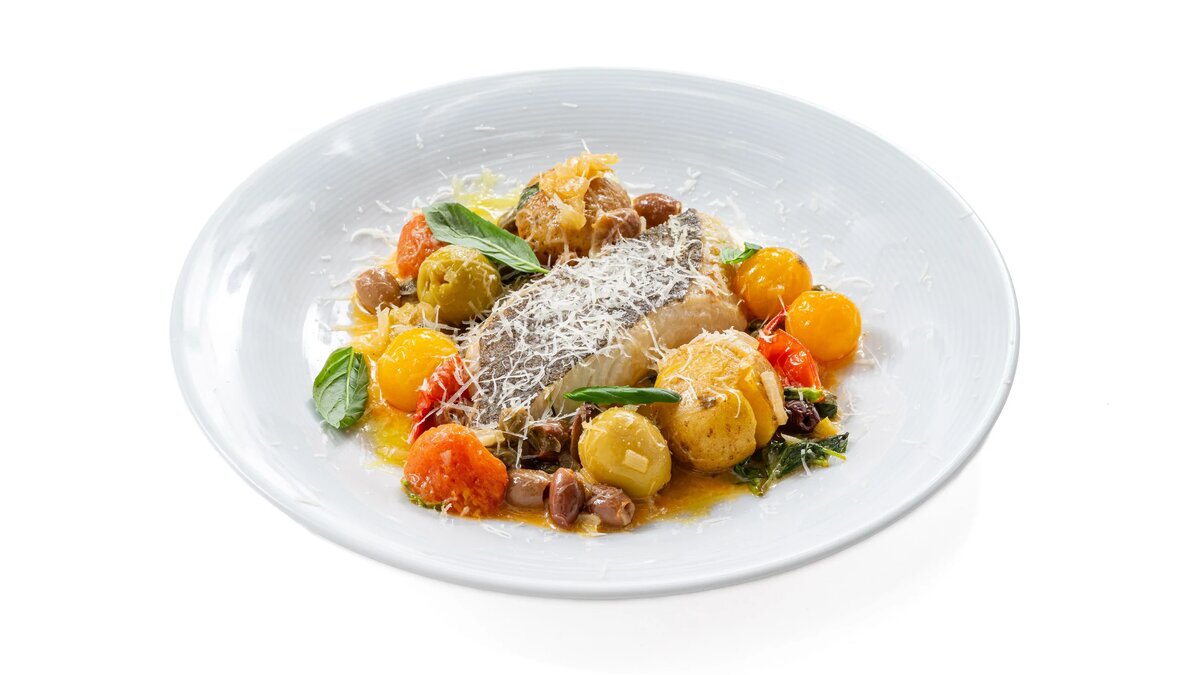 Подготовьте все ингредиенты, чтобы процесс готовки прошел без сучка и задоринки.Вскипятите воду в кастрюле, подсолите и добавьте картофель. Варите его 10-15 минут до мягкости, чтобы он стал идеальной основой для блюда.Тем временем нарежьте лук мелкими кубиками. Это поможет ему равномерно прожариться и напитать блюдо своим вкусом.Разогрейте сковороду и добавьте растительное масло. Выложите филе палтуса кожей вниз и жарьте 2 минуты до золотистой корочки. Затем переверните рыбу на другую сторону и готовьте еще 2 минуты.Переложите рыбу на чистую тарелку. В сковороду добавьте нарезанный лук, раздавленные зубчики чеснока и жарьте все вместе несколько минут для насыщения ароматом.Положите каперсы и влейте вино. Дайте ему выпариться в течение 30 секунд, чтобы оставшийся аромат стал более концентрированным.Добавьте оливки, маслины и помидоры черри, жарьте еще 2 минуты, чтобы они раскрыли свои соки и добавили свежести.Верните вареный картофель в сковороду. Можно слегка его раздавить, чтобы он стал более нежным и пропитался ароматами.В завершение добавьте сливочное масло, помешивайте в течение 2 минут, пока оно не растает и не смешается с остальными ингредиентами.Порвите листья базилика и добавьте их в сковороду. В этом этапе смесь должна настояться еще 20 секунд, чтобы ароматы объединялись в каждом кусочке.