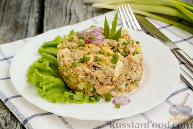 - Салат с сардинами, яйцами и луком. Этот салат наполнен насыщенными вкусами и станет отличным дополнением к любому столу. Сочетание сардин, яиц и свежего лука дарит салату особую пикантность и сытность.