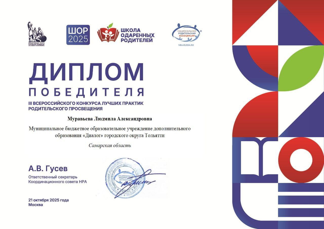 На мероприятии были подведены итоги всероссийского конкурса лучших муниципальных практик по улучшению условий и методов воспитания. Для тольяттинцев участие в конкурсе стало успешным! Коллектив муниципального учреждения дополнительного образования «Диалог» занял первое место в категории «Лучшие практики родительского просвещения» с проектом «Компас добрых перемен».