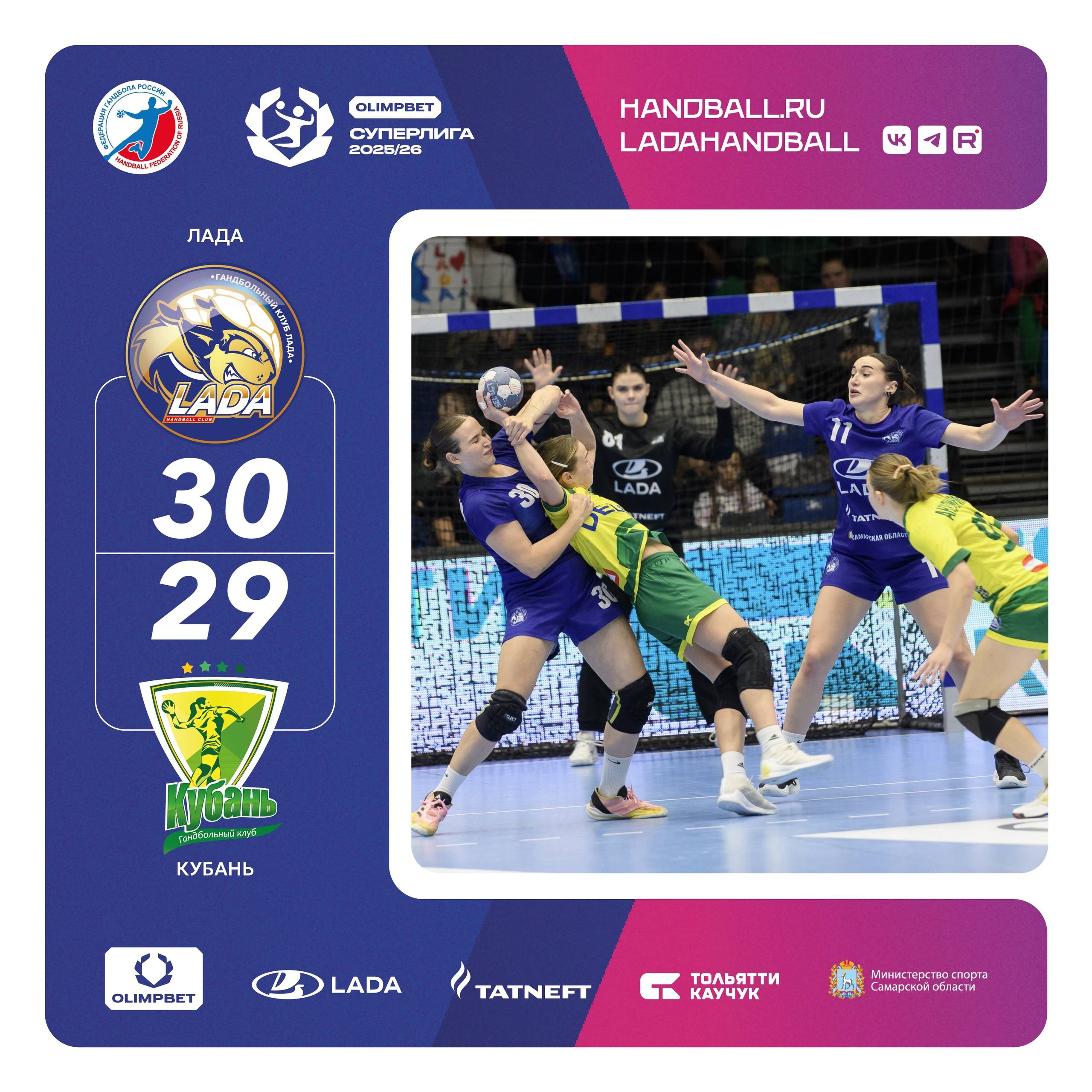 Гандбольная «ЛАДА» Тольятти обыграла краснодарскую «Кубань» со счетом 30:29 (18:11).