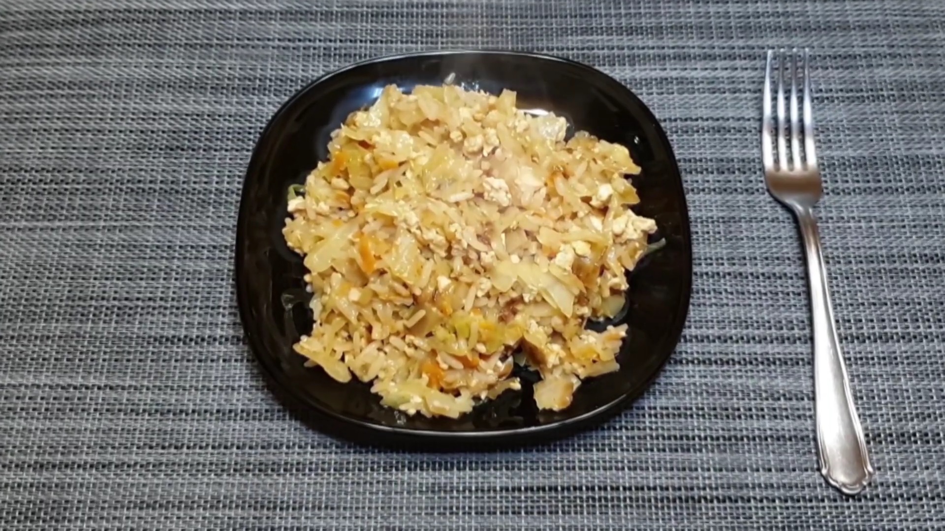 Промойте рис и сварите его до полуготовности. Капусту измельчите, приправьте солью и специями. После обжарьте овощ до золотистого цвета. Морковку натрите на терке и нашинкуйте лук.