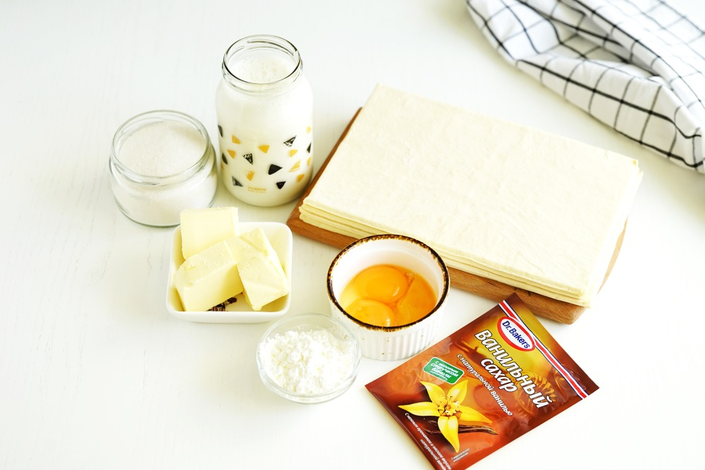 Для начала следует заранее разморозить слоёное тесто, чтобы оно стало мягким. Лучше использовать дрожжевое тесто, так как оно придаст торту необходимую легкость. Также важно, чтобы в составе теста было сливочное масло.