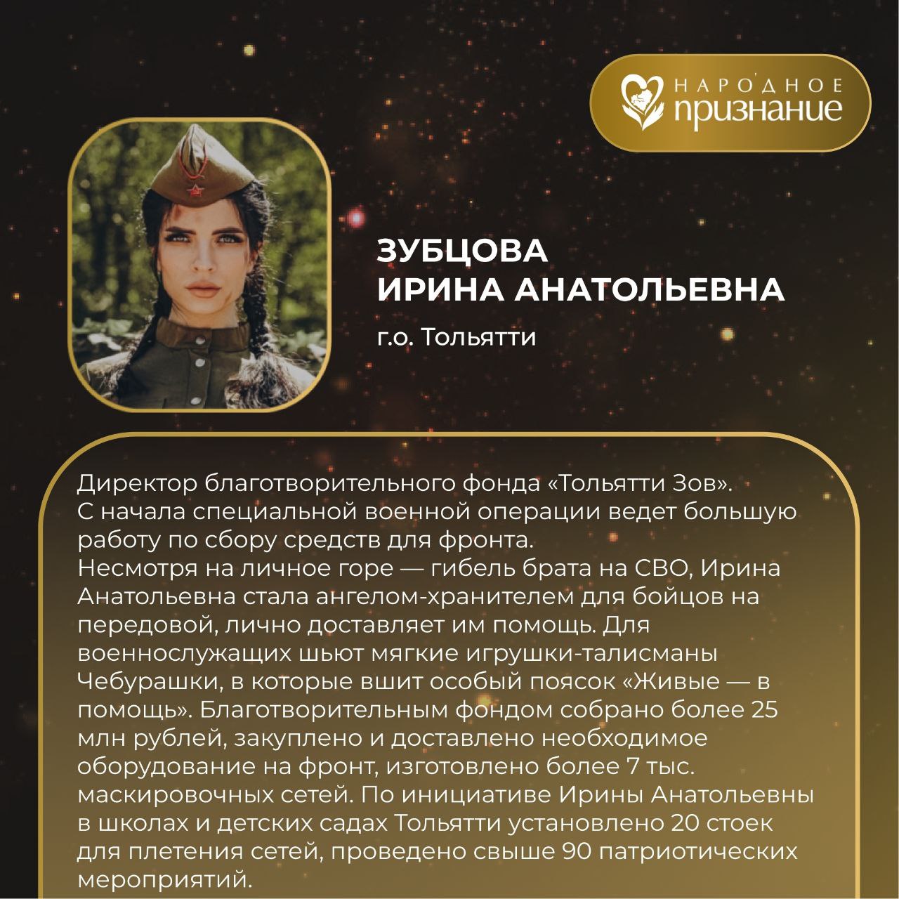 Ирина Зубцова - организатор волонтерского движения «ТольяттиZOV», директор Благотворительного фонда «Тольятти ЗОВ», член Самарской Областной Общественной Организации Военно-Исторический Клуб «ПАТРИОТЫ». Зубцова И.А. на постоянной основе лично сопровождала и доставляла гуманитарные грузы в зону СВО, для передачи в руки бойцам. Также, при непосредственном участии и руководстве Ирины Анатольевны, с учащимися школ проводятся патриотические мероприятия, в том числе мастер-классы по плетению сетей и собиранию сухого армейского душа.