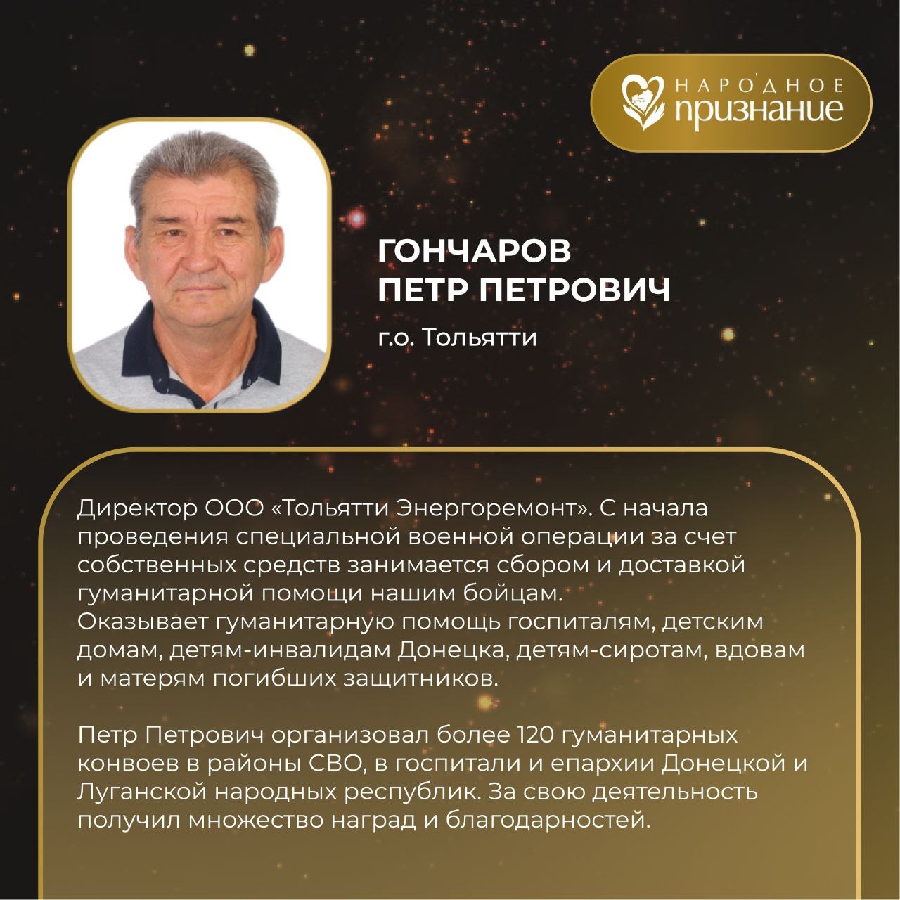 Петр Гончаров - директор ООО «Тольятти ЭнергоРемонт». С начала СВО Гончаров П.П., самоотверженно посвятив себя делу гуманитарной поддержки, занимается сбором и доставкой благотворительной помощи в зону СВО. Доставка адресной помощи организована в бригады спецназа, штурмовые подразделения, артиллерии, подразделений БПЛА и спецвооружений.