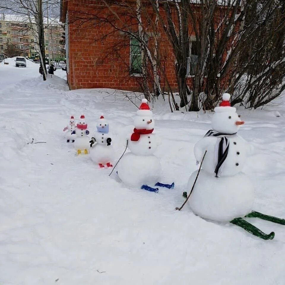 - На зарядку становись! — Эта снежная семья решила не просто стоять на месте, а встала на лыжи, готовясь к активной зимней прогулке. Неизвестно, куда они намерены отправиться, но это точно привлечет внимание!