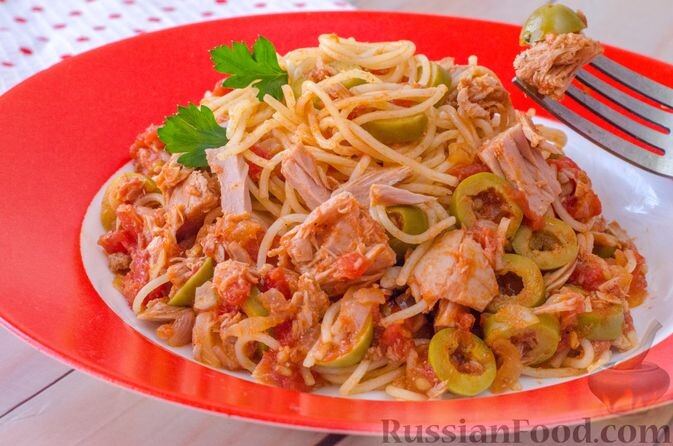 - Паста с тунцом и оливками в томатном соусе. Соус из свежих помидоров, обжаренного лука и чеснока создаст яркий вкус. Рецепт включает консервированного тунца и оливки, а также немного острого перца для пикантности.