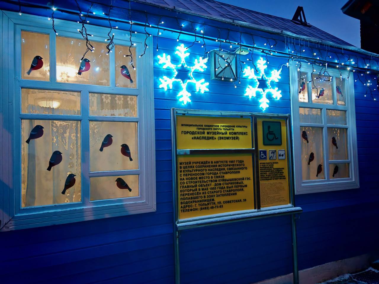 Музей "Наследие" — это красивый дом с резными окнами. Зимой он становится еще привлекательнее. В этом году администрация Тольятти выделила средства на праздничное оформление фасада музея. Теперь он выглядит по-настоящему сказочно. Этот красочный домик радует жителей частного сектора и проезжающих мимо автомобилистов, создавая праздничное настроение в уголке города, который в 50-е годы ХХ века считался центром Нового Ставрополя.