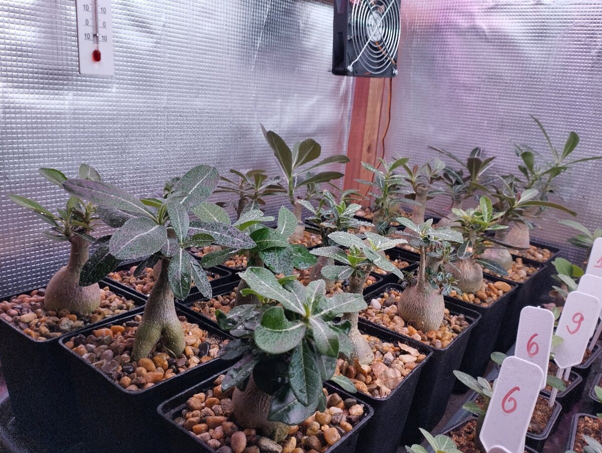 После обрезки адениумы начинают стремительно развиваться, каждый из них в своем уникальном стиле. Некоторые растения выпускают новые ветви, в то время как другие формируют плотные кроны. Особое внимание привлекает один из «баобабов», который, казалось бы, решил вырасти в разных направлениях одновременно, превращаясь в настоящую зелёную симфонию.