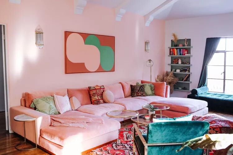 Опустим обсуждения специфических стилей живописи — вместо этого сосредоточимся на эффекте, который может произвести большая картина. Одна лишь массивная работа может заполнить пространство и стать ярким акцентом. При выборе картин важно учитывать цветовую палитру. Например, неожиданные сочетания «королевского синего» и ярко-апельсинового крепят атмосферу и добавляют энергичности.