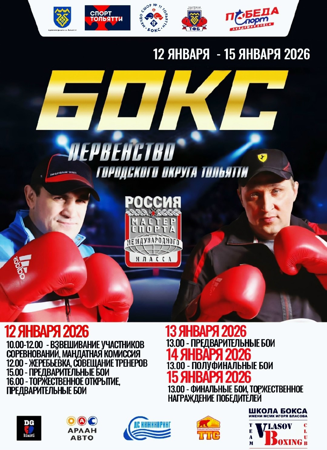 С 12 по 15 января во дворце спорта "Волгарь" пройдет первенство Тольятти по боксу на призы мастеров спорта международного класса России, двукратного чемпиона Европы Деви Гогия и финалиста Кубка мира Игоря Власова!