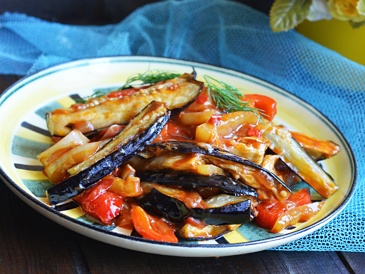 Для начала стоит подготовить овощи: два баклажана нарезать брусками, посолить и оставить на 20 минут. Это поможет избавиться от лишней влаги, чтобы они при жарке не брызгали. После этого отжатые баклажаны будут готовы к жарке. Тем временем нарезаем два болгарских перца (предпочтительно цветных) и одну луковицу как можно мельче. Чеснока понадобится пять зубчиков, а также немного перца чили по вкусу, пишет канал "Рецепты с фото и видео - только лучшее от Аймкук".