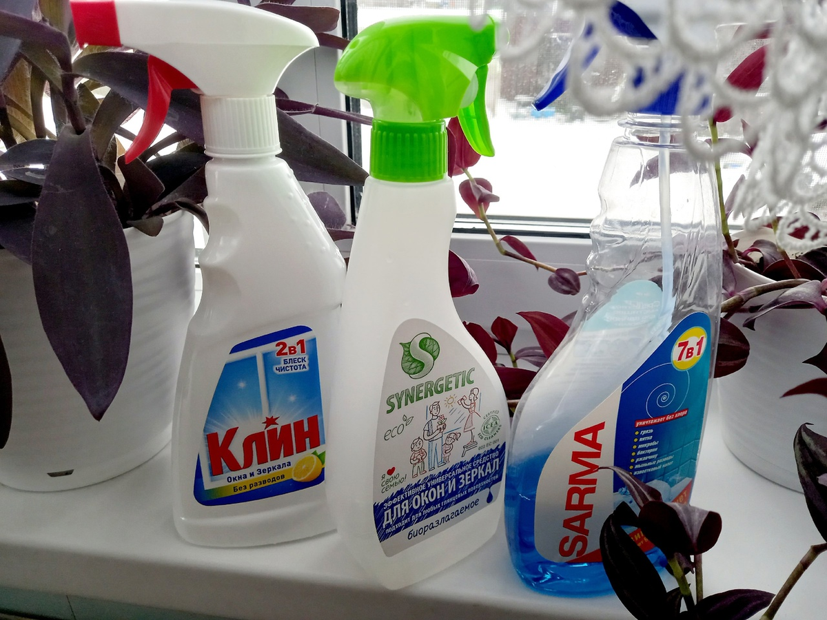 - Для мытья окон идеально подойдут недорогие жидкости, такие как "Клин", "Сарма" и "Синергетик". Они демонстрируют одинаково высокую эффективность, и окна после их применения блестят, а запах минимален.