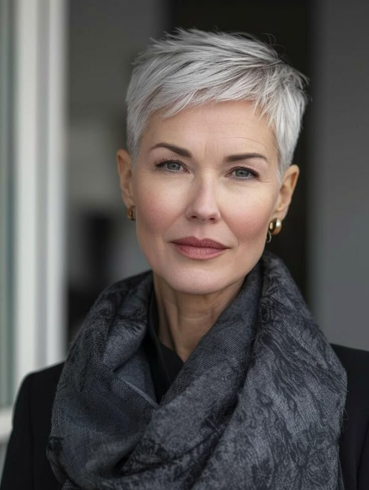 - Дерзкая короткая стрижка: Идеально подходит как для тех, кто решил оставить сединку, так и для любительниц окрашивания. Она простая в укладке и позволяет экспериментировать с образом.
