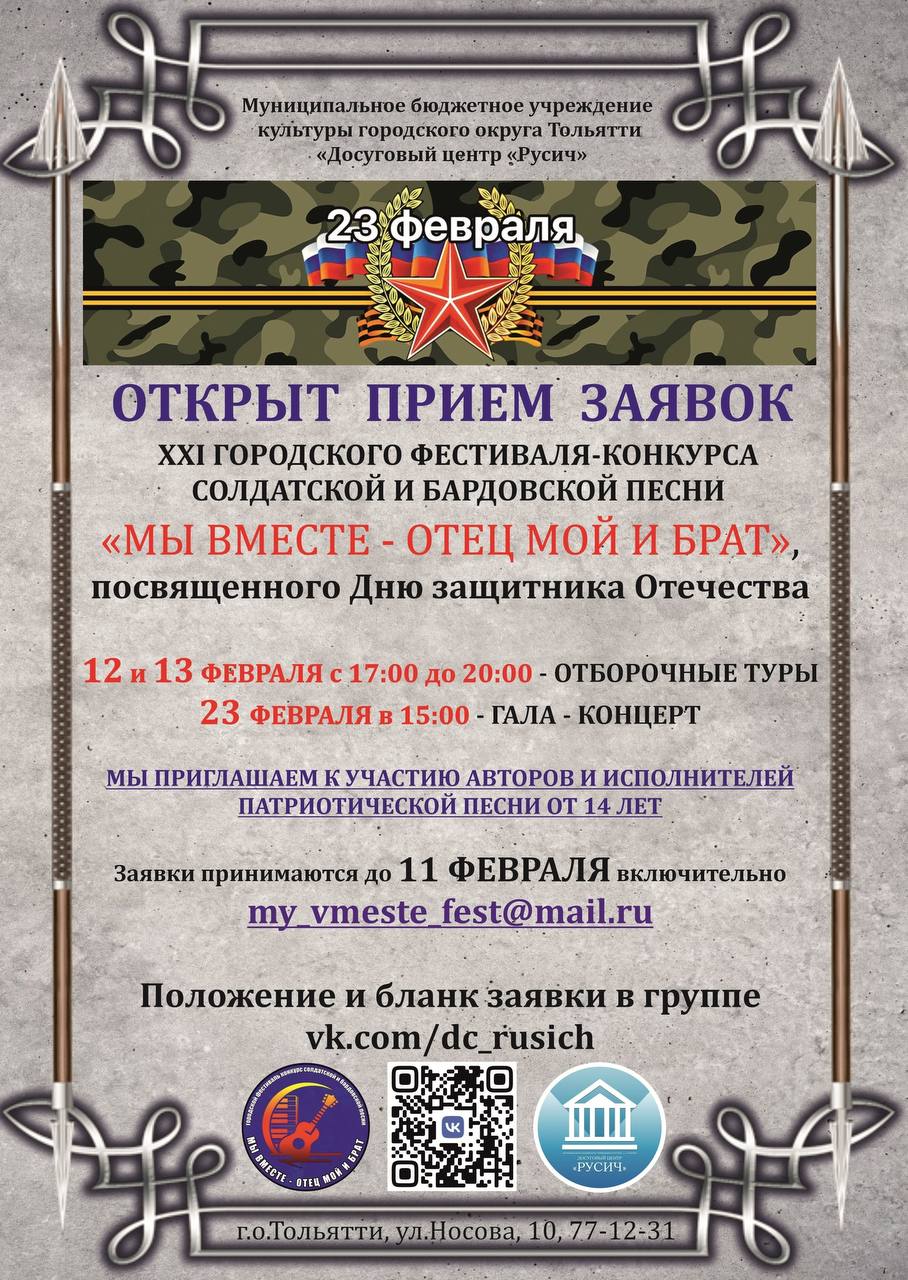 Досуговый центр «Русич» при поддержке департамента культуры администрации в этом году проведёт XXI городской фестиваль-конкурс солдатской и бардовской песни «Мы вместе – отец мой и брат», посвящённый Дню защитника Отечества.