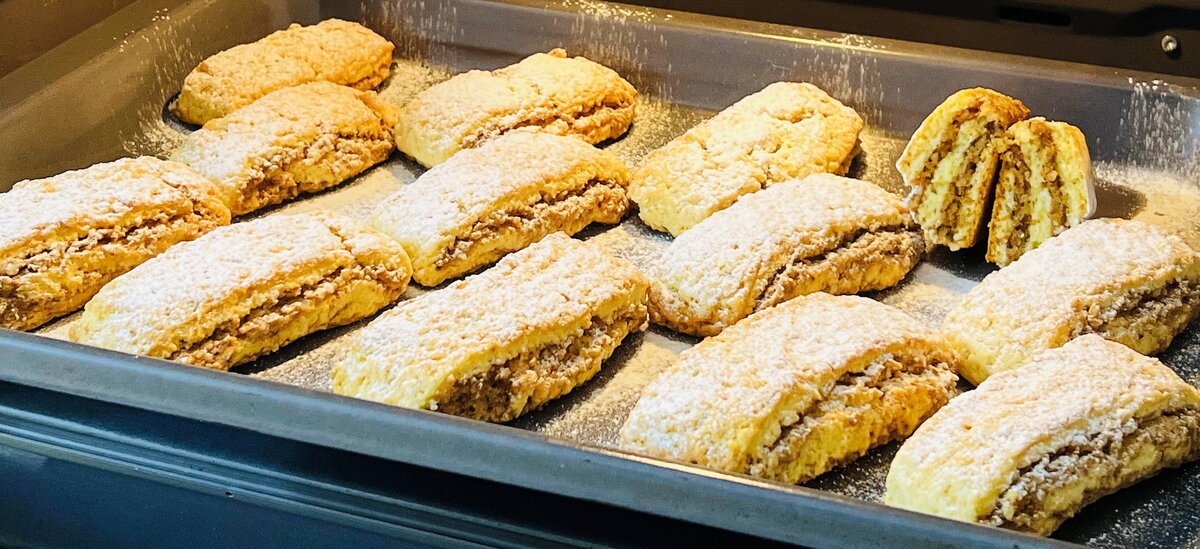 Для начинки необходимо измельчить грецкие орехи и смешать их с сахаром, белками и корицей. Далее раскатайте тесто на пласт толщиной 4-5 мм. Выложите начинку на две трети пласта теста и аккуратно сверните в рулет или сложите его. Нарежьте полученное изделие на небольшие кусочки и выложите их на противень.