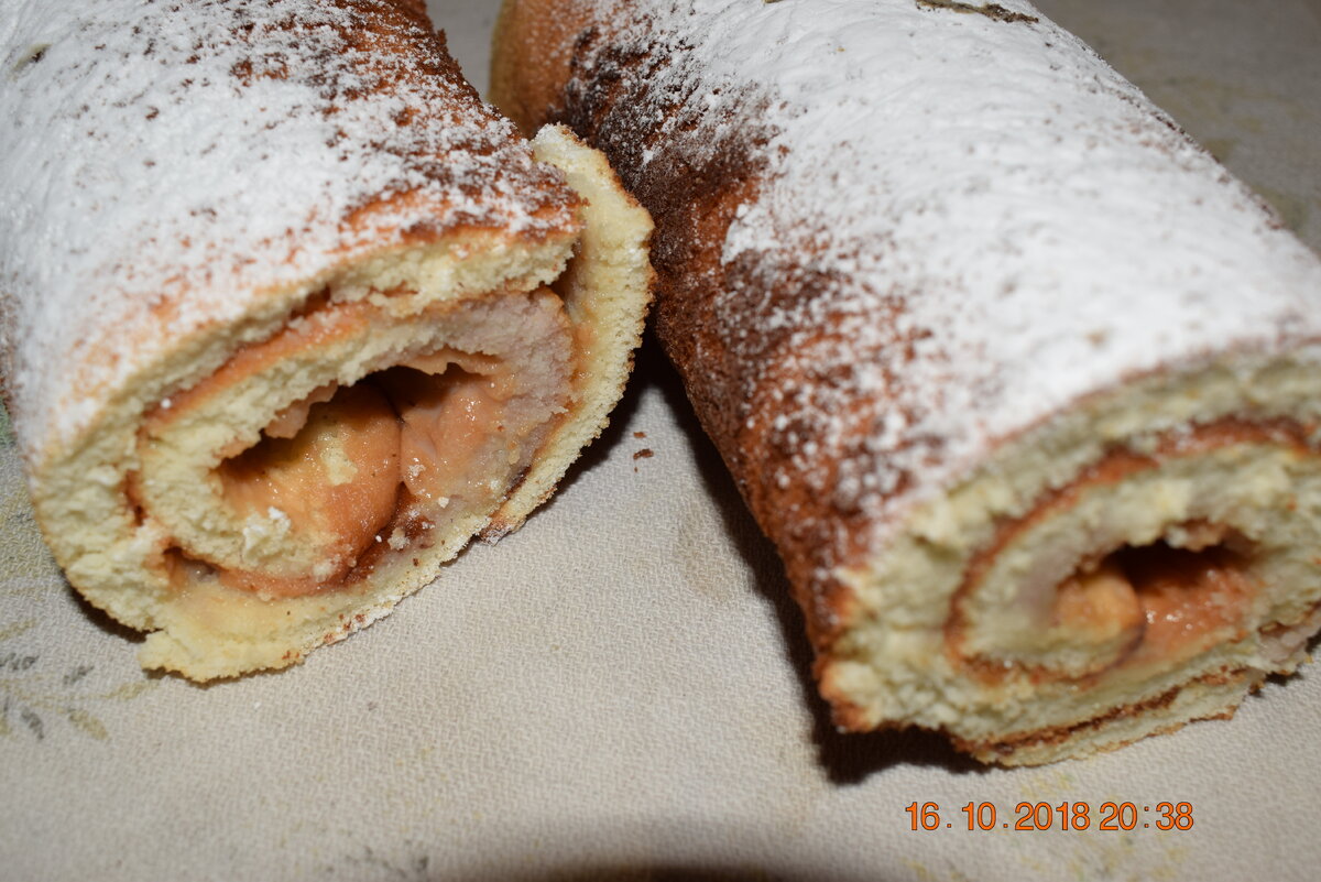 Духовку разогреваем до 170-180 °C и ставим рулет выпекаться на 15-20 минут. Как только верх станет золотистым, можно вынимать из духовки. Для дополнительной сочности пропитайте десерт сахарным сиропом или алкоголем по вкусу, или просто намажьте вареньем — это предотвратит ломкость при скручивании рулета.