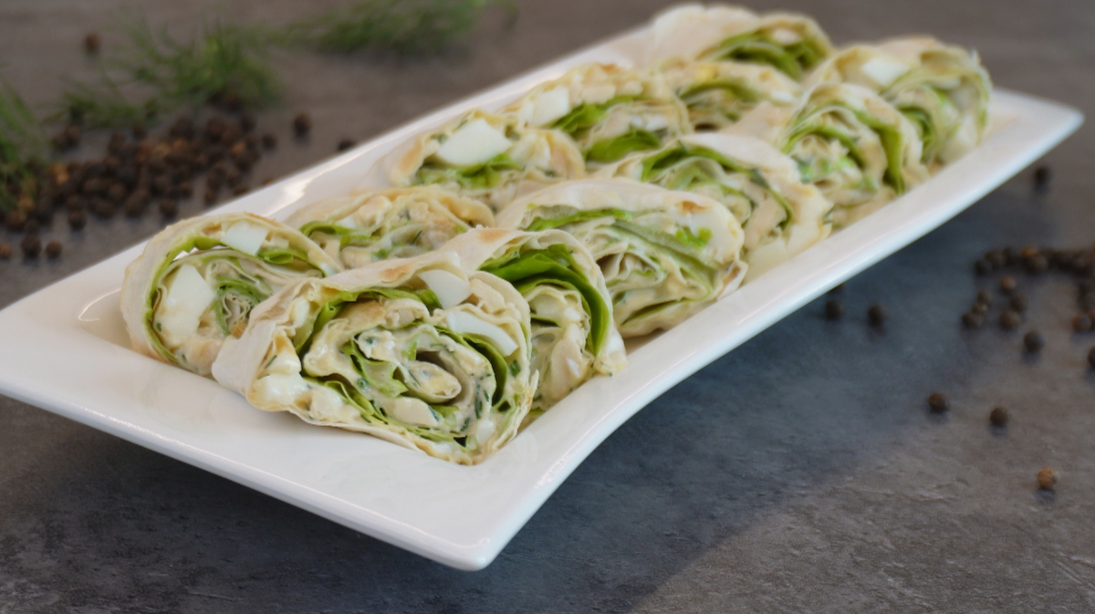 Приготовление начинается с заготовки начинки: яйцо сварить вкрутую и нарезать кубиками. Печень трески размять вилкой, оставить немного масла для сочности. Соединить с яйцами, заправить майонезом, поперчить и добавить зелень. Рулет собирается на лаваше: начинку равномерно распределяют поверх листа, добавляют хруст салата и осторожно сворачивают, сначала подтягивая края, потом скатывая плотный рулет.