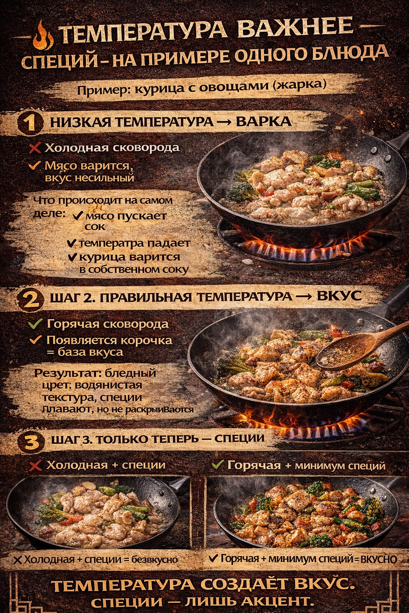 Вывод из наблюдения: вкус начинается с того момента, когда еда встречается с правильной температурой, и специи работают как поддержка, а не как замена тепловой основы.