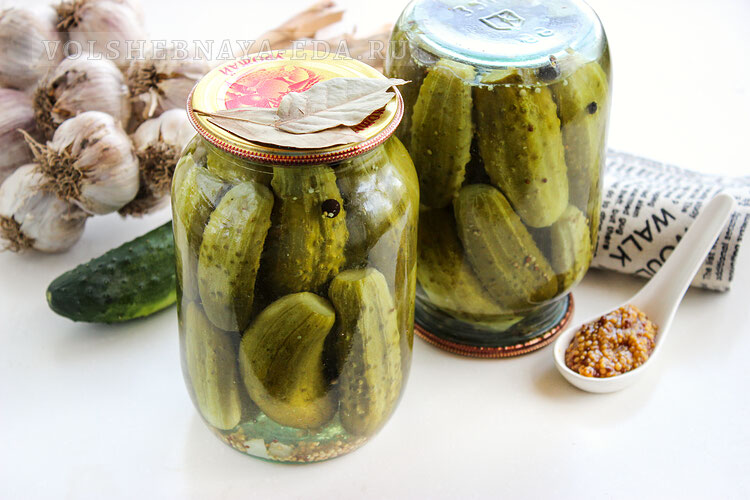 Срезайте кончики и раскладывайте огурцы в банки, где на дно положен лавровый лист и перец. Добавляйте по два зубчика чеснока в каждую банку и щедро присыпайте зерна горчицы.