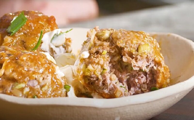 3. Сборка: Из мясной массы сформировать крупные фрикадельки и разложить их в заранее подготовленную форму для запекания. Украсить острым перцем, нарезанным сельдереем и грибами. Полить все приготовленным томатным соусом и немного посолить. Накрыть форму фольгой, поместив в разогретую до 180 градусов духовку. Запекать в течение 30-40 минут.