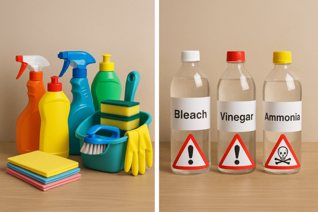 - Смешивание уксуса с хлорсодержащими средствами может привести к вредным химическим реакциям.