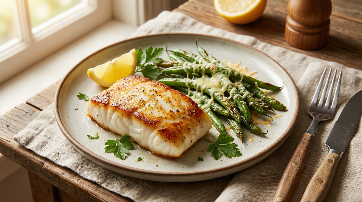 Золотистое филе белой рыбы с хрустящей корочкой в сочетании с ароматной запечённой стручковой фасолью и пармезаном — это блюдо, которое не только выглядит эффектно, но и готовится удивительно быстро. Всего 8 граммов углеводов на порцию делают его идеальным для поклонников кето и палео диет.