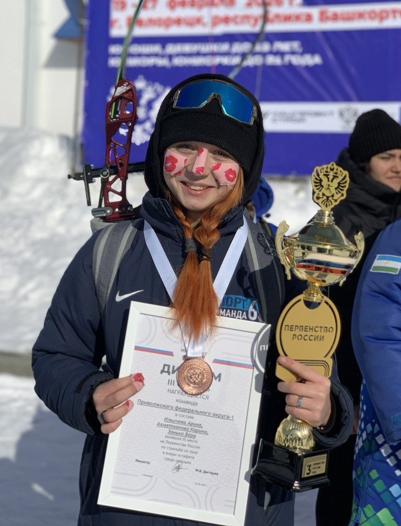 Соревнования лыжников-лучников проводятся в этом башкирском городе с 19 по 27 февраля. Наша перворазрядница Вера Занько, которую тренирует Ольга Уколова, стала вместе с двумя подругами по сборной команде Приволжского федерального округа третьим призером в эстафете 3х6 км с двумя стрелковыми рубежами!