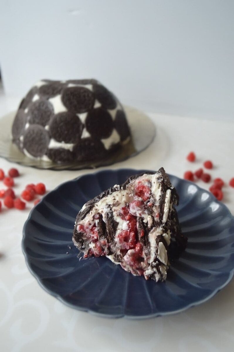 Первоначально разделить печенье на две части: крем и бисквит, оставив 10 целых печенек.Ягоды промыть и обсушить. При необходимости нарезать на небольшие кусочки.В отдельной миске объединить кремовую часть от печенья, творожный сыр, сливки и сахарную пудру. Взбить до получения однородной массы.Форму застелить пленкой для удобного извлечения готового торта.Каждое печенье быстро обмакнуть в молоке и уложить на дно формы, сторона с надписью должна быть внизу. Формировать слои в порядке: крем, ягоды, печенье, повторяя, пока не закончатся компоненты. Завершить целыми печеньками для усиления структуры.Торт накрыть пленкой и убрать в холодильник минимум на 4 часа для застывания.Вынув торт из холодильника, снять пленку сверху, накрыть плоской тарелкой, перевернуть и убрать пленку.Ваш сладкий шедевр готов! Для тех, кто не любит орео, можно использовать любое другое печенье по вкусу. Приятного аппетита!