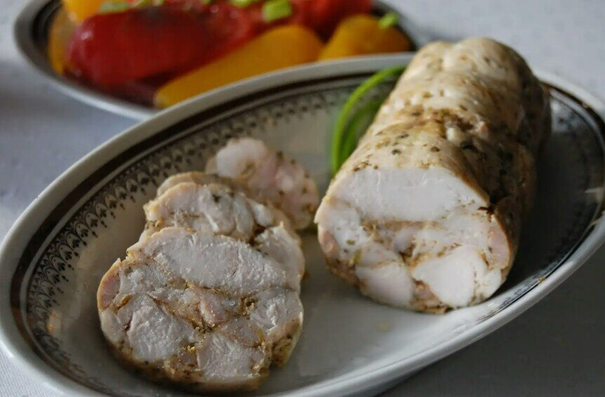 Кроме того, при желании можно использовать желатин, чтобы колбаса стала более плотной. Но даже без него можно обойтись, просто плотно завязав рулет.