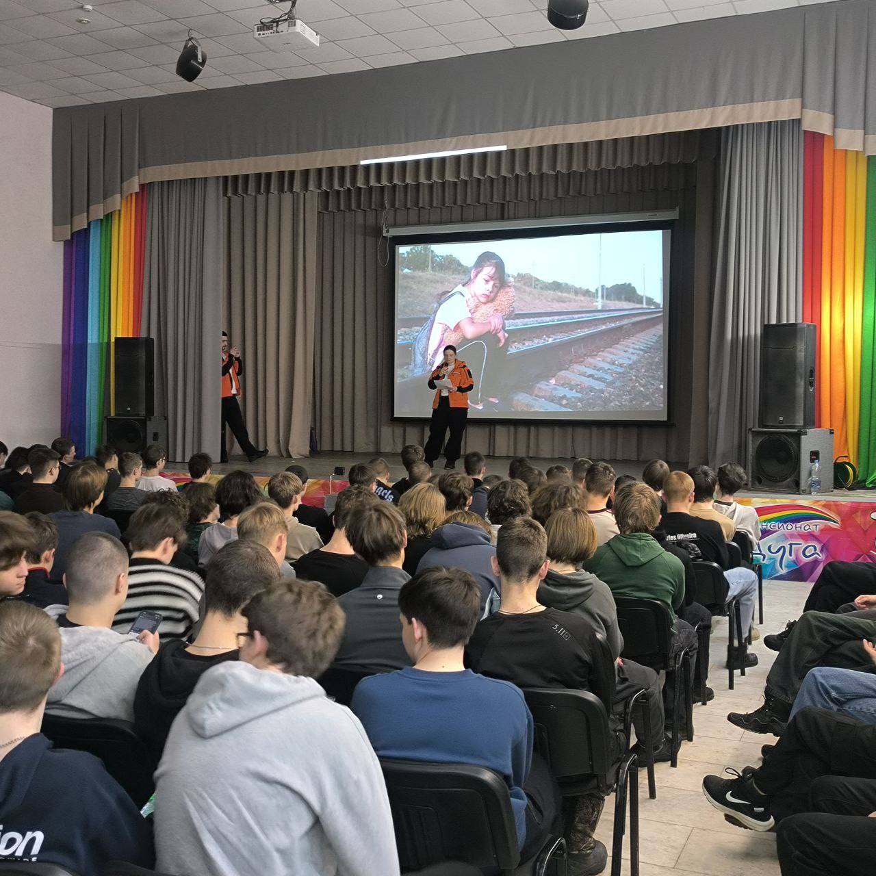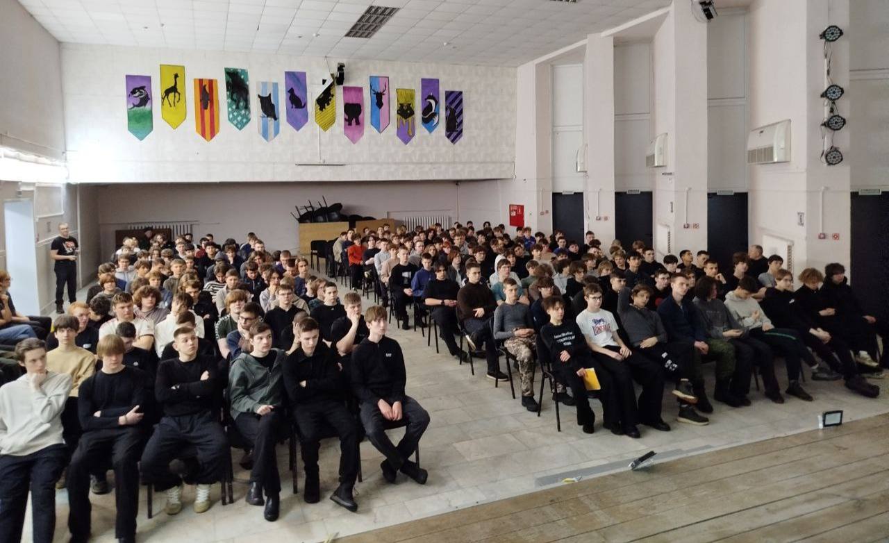 Знаковая встреча прошла пансионате «Радуга». Около 300 старшеклассников собрались, чтобы узнать о работе отряда из первых рук. Атмосфера в зале была живой и заинтересованной: шум голосов, горящие глаза ребят — чувствовалась настоящая молодёжная энергия.