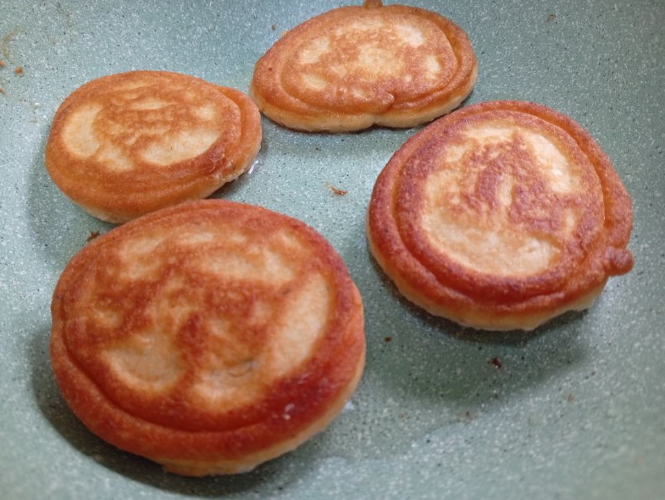Разогрейте на сковороде немного растительного масла. С помощью ложки выкладывайте тесто, и благодаря пекарскому порошку оладьи поднимутся.