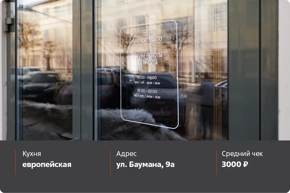 - Atelier Mira: Концептуальный бар на Баумана от шефа Дамира Газизова. Здесь можно попробовать уникальные коктейли и вкусные блюда в стильном интерьере, созданном с изысканным вкусом.