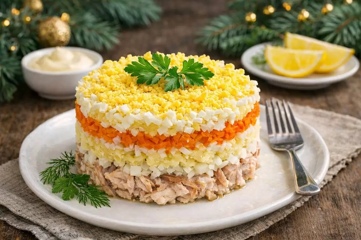 Этот вариант нравится всем за счёт отсутствия резкого запаха рыбы, чёткой структуры слоёв и сбалансированного вкуса. Если готовить заранее, достаточно 2–3 часов до подачи, чтобы салат пропитался, но сохранил форму.