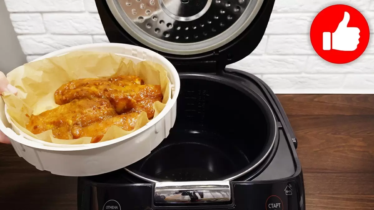 Затем в корзину пароварки укладывается пергамент для выпечки, на который помещают замаринованное куриное филе. В чашу мультиварки наливают 500 мл холодной воды, после чего устанавливается корзина с курицей. Готовить нужно на режиме «Варка на пару» в течение 40 минут, чтобы мясо получилось максимально нежным и ароматным.