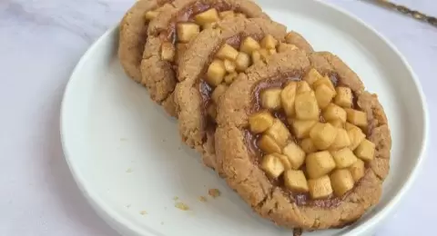 Духовка разогревается до 170 градусов. После этого из теста формируют 5 шариков, куда дегустаторы с удовольствием добавят начинку. Шарики помещаются на пергамент, прижимаются и формируются в виде коржей с углублением для начинки. Выпекать печенье нужно около 17-20 минут, пока оно не станет золотистым. Дать остыть на противне, а затем перенести на решетку.