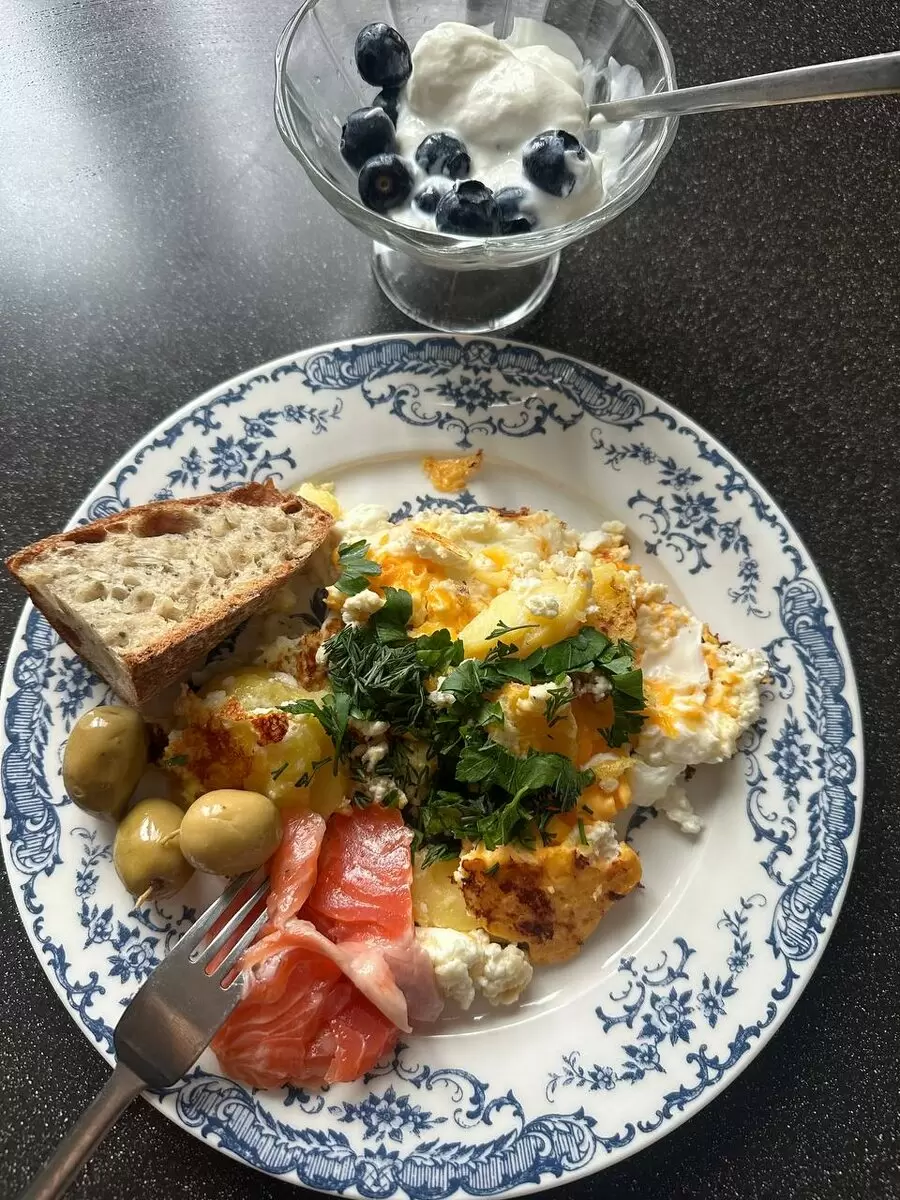 На завтрак был подан отварной картофель, дополненный творогом и залитый яйцами. Обилие оливок и нежная семга добавили изюминку к этому утреннему угощению. Не забыли о йогурте с голубикой, который стал прекрасным десертом и настоящей находкой для ценителей здоровья.